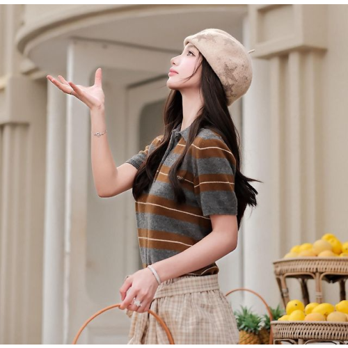MIUMIU 미우미우 64296 스트라이프 코튼 실크 니트 폴로 반팔